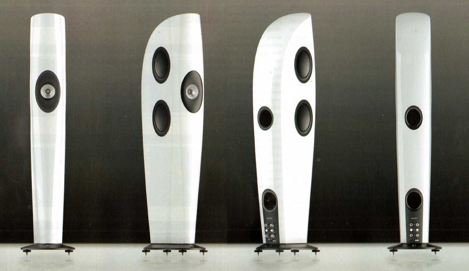 Die Lösung des Problems: die virtuelle Punktschallquelle. Das bedeutet nichts anderes, als vier identische Basstreiber rund um den Koax anzuordnen, so dass sich alle vom Hörer wahrgenommenen akustischen Zentren auf einer Achse befinden. So weit, so schwierig - denn auch diese Anordnung will in eine möglichst breite Schallwand verbaut werden. Damit das Gehäuse selbst schmal bleiben kann, kamen die KEF-Ingenieure auf die geniale Idee, die Schallwand komplett rund zu gestalten und um Front und Seitenteile herum zu biegen, womit der ganze Lautsprecher fast nur noch aus der Schallwand besteht und die Tieftöner auf der Seite Platz nehmen können. In diesem frühen Stadium der Entwicklung wurden die Designer bereits mit einbezogen; sie gaben dem Konstrukt auch zugunsten der Steifigkeit dte geschwungene Form einer Klinge.