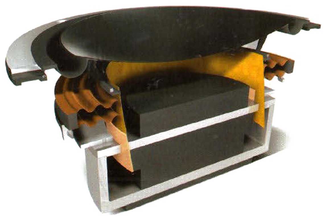 Der flache Tieftöner gewinnt dank sehr großer Schwingspule und doppelter Zentrierung die benötigte Stabilität, ohne zu taumeln